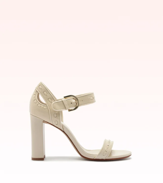 Com salto bloco de 90 mm, o Lina 90 une design gráfico e sofisticação artesanal. O cabedal em tiras de couro cria um jogo elegante de transparências e texturas, enquanto a mistura de napa e couro envernizado adiciona brilho e profundidade ao visual. Um modelo moderno e versátil para elevar qualquer produção.